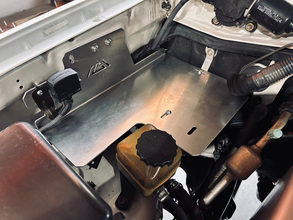 La instalación no requiere ningún recorte, perforación ni modificación en su Lexus GX470. La bandeja de accesorios del compartimiento del motor está diseñada para atornillarse a los orificios roscados existentes. Gracias al soporte adicional, esta placa puede soportar más peso que otras opciones del mercado.